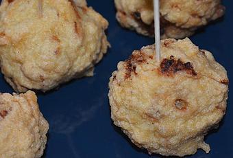 Una vez la masa fría, moldeamos unas croquetas en forma redonda y preparamos la pasta de fritura, separando la yema del huevo y mezclando con el resto de ingredientes para la pasta de fritura, cuando lo tenemos todo bien mezclado le añadimos la clara de huevo batida a punto de nieve.