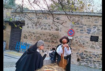 Todo tiene un halo de misterio: no sabes dónde será el concierto. Quedamos en Toledo, en una plaza donde está la Escultura Lugar de encuentros V, de Chillida, junto a la Puerta Antigua de Visagra, y nos recibieron dos personajes pintorescos: una musa y un mendigo medieval vendedor de textos. Luego, nos dividieron en dos grupos y nos fueron hablando de los sitios por los que pasábamos y de la historia de Toledo.