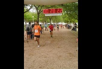 Hacia el ecuador de la prueba, nos adelanta -a más velocidad que ningún otro- un corredor veterano que va cargado con un mochila que tiene pinta de pesar unos cuantos kilos (¿estaría preparando alguna otra prueba?). Pienso que ya es hora de ponerse a correr 'de verdad' y me voy con él, teniendo que subir notablemente el ritmo (ya por debajo de los 4'30"/km). Aguanto con él durante un par de kilómetros, adelantando mucha gente, pero a ese ritmo sí que sufro lo mío (cada vez más rápido, e incluso creo que comenzamos a correr por debajo de 4'15"/km). El bochorno me hace daño, pero sé que queda poco (¿unos 500m?) y tiro hacia adelante. Al pasarle, le hago un gesto y le digo: "gracias". Yo, por fin, me veo yendo rápido (quizá por debajo de 4'/km), aunque la carrera se está acabando a marchas forzadas. Bajo la rampa que pasa por debajo del último puente bastante rápido y allí se me intenta enganchar un chaval. En la rampa de subida -¡esto se me da bien!- un conocido le aprieta y él aprieta, pero yo ponga una marcha más y me distancio bastante. Llego a la recta final, al tramo de grava, y adelanto al último grupo que veo delante. En los últimos minutos me dejo llevar y entro en meta con el crono marcando 28'22".