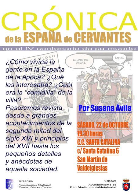 La Asociación Cultural Teatro Sierra Oeste, de San Martín de Valdeiglesias, propone una nueva actividad cultural, la conferencia "Crónica de la España de Cervantes", un recorrido a través de la vida en el siglo XVI, destacando algunas de las noticias más importantes que arcaron esa época.La periodista madrileña Susana Ávila es la responsable de analizar la historia, la política, la economía y la sociedad españolas a tarvés de la vida de Miguel de Cervantes, que sirve como hilo conductor y como anclaje.