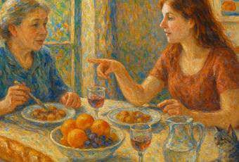 Antes, me entrega un par de libros: uno para Paco y otro, de cocina vegetariana, para mí. También una prenda que asegura no le sienta bien. En efecto, el color hueso no es el suyo… ni el mío. A las dos nos hace parecer enfermas de ictericia. Pero yo aún puedo disimularlo con un pañuelo o con algún otro truco, artimañas para las que ella afirma —entre risas— no estar dotada.