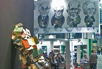 Curioso montaje a base de libros en la entrada de Liber. Foto: Benjamín Recacha