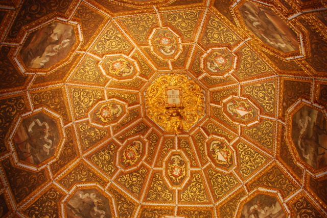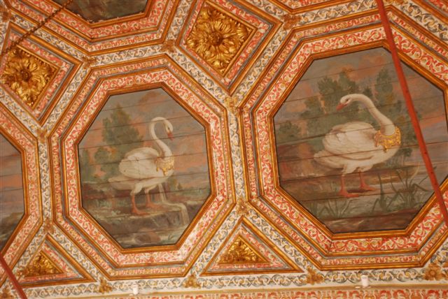 SALA DE LOS CISNESLa mirada queda cautiva en el soberbio artesonado, con pinturas de estas gráciles aves de albo plumaje. No concluyen aún las experiencias de embeleso.