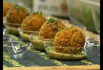 Cortar 1 hinojo y 1 zucchini en cubos chicos. Cocinar en una sartén con aceite al ajo. Incorporar los champiñones picados y cuando estén cocidos, agregar las aceitunas picadas y las alcaparras. Revolver. Sumar el arroz, el vino blanco y la sal. Cuando se evapore el alcohol, agregar un poco de caldo. Antes de que se termine de cocer el arroz, incorporar los langostinos, los mejillones y los berberechos cortados en pedazos muy pequeños. Cocinar y cuando esté el punto del arroz, retirar. Mezclar con 2 huevos enteros y reservar hasta que se enfríe. En una sartén, dorar hinojo y cebolla de verdeo cortados en julianas finitas con aceite de ajo. Salpimentar. Cocinar durante 5 minutos y agregar ½ taza de vino blanco, los berbechos cortados chicos y un poco de aceite de oliva. Cuando se haya evaporado el alcohol, incorporar la crema de leche y retirar del fuego apenas rompa el hervor. Procesar y reservar. Hacer bolitas con el arroz frío y pasarlas por harina, después huevo y por último panko. Freírlas en una olla con abundante aceite neutro. Servir las bolitas de arroz encima de la crema de berbechos. Decorar con 1 gota de salsa picante y perejil picado.