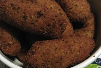 Al día siguiente coger porciones de masa con una cuchara, darles forma de croqueta con la mano y pasar por huevo batido y pan rallado dos veces (alternativamente). Si os salen muchas podéis ponerlas en un recipiente y congelarlas.