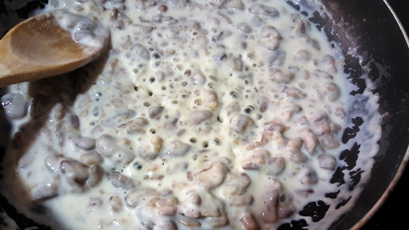 7. - Colamos el agua de hervir los pies de los boletus y le añadimos a la bechamel 2 o tres cazos, para darle más sabor, y seguimos removiendo hasta que esté a nuestro gusto. Apartamos y dejamos enfriar.