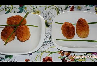Formamos las croquetas, las vamos pasando por huevo y pan rallado y las freímos en abundante aceite caliente.