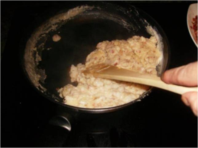 Trabajamos bien la masa.Cuando agotemos el caldo le vamos añadiendo la leche.