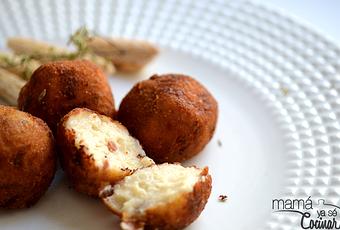 - Con las manos cogemos un trozo de masa de croquetas y le damos forma redonda. También podéis con dos cucharas darle forma más ovalada.