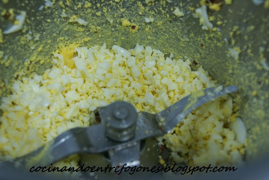 2. Ponemos los huevos ya cocidos en el vaso de la thermomix y seleccionamos 2 segundos velocidad 4, y reservamos.