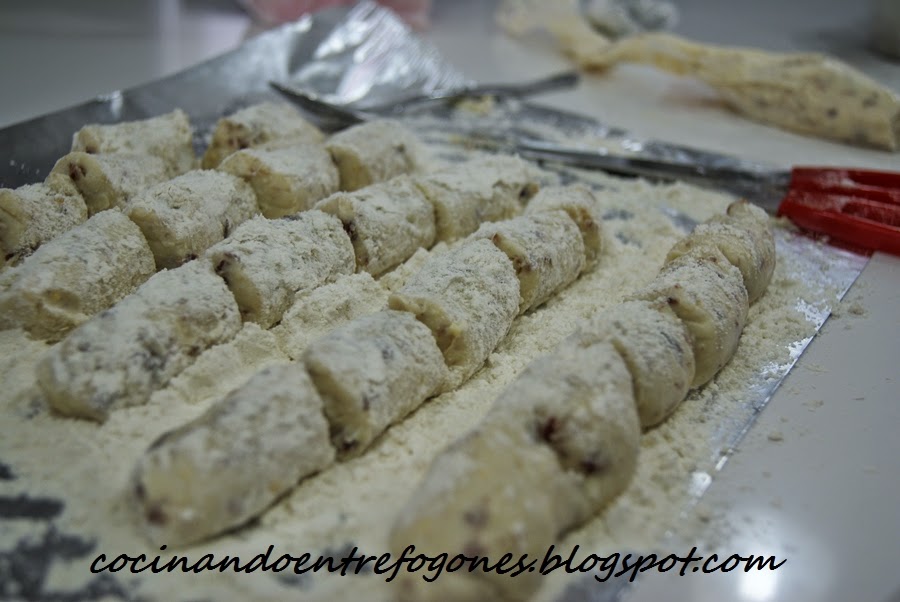 7. Ya fría nuestra masa podemos coger con una cuchara pequeñas porciones de masa y darle forma, o en mi caso, he metido la masa en una manga pastelera, hacemos una fila con la masa encima de harina para que no se nos pegue y con unas tijeras las vamos cortando todas del mismo tamaño.