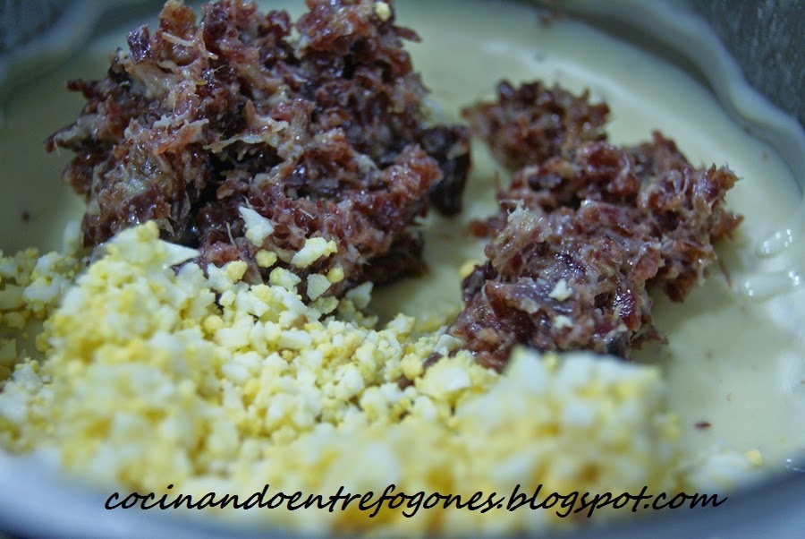 5. Después de unos minutos agregamos el resto del jamón y el huevo cocido reservado y mezclamos bien con la espátula.