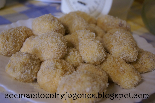 3. Hacemos bolitas con nuestra masa de croquetas y pasamos por harina, huevo y pan rallado.