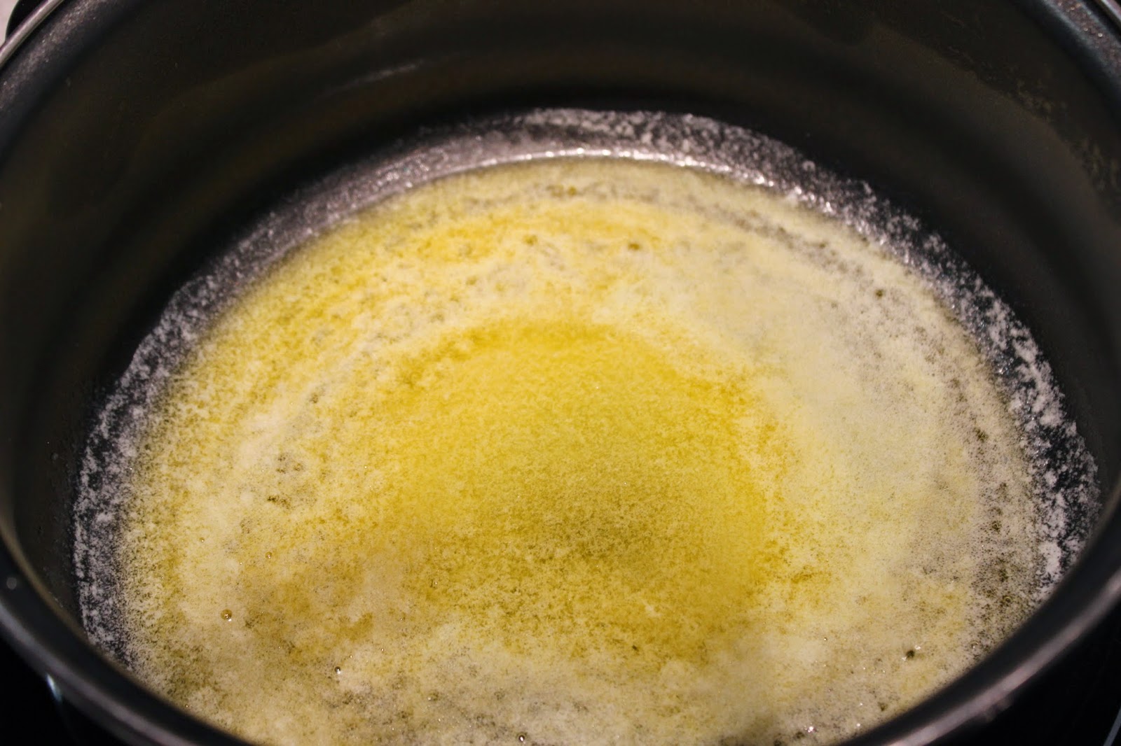 En una cacerola, echamos la mantequilla, la derretimos a fuego medio, agregamos la harina y la cocinamos sin parar de moverlo durante 2 o 3 minutos hasta que se