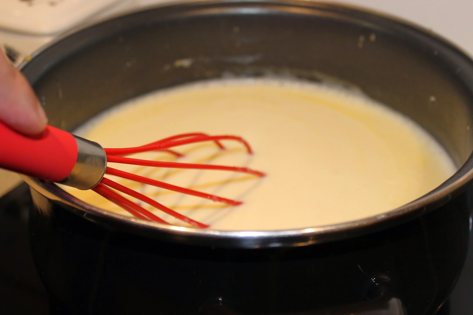 quite el sabor a crudo. Cuando veamos que la harina está bien cocinada retiramos la cacerola del fuego y añadimos la leche sin la cebolla.Removemos sin parar y volvemos a incorporar al fuego, hasta que nos quede espesa a nuestro gusto.