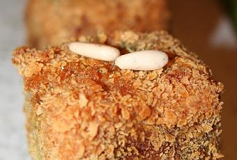 Estos cubitos pasarlos, con cuidado y mimo, por harina, luego bien por el huevo y, por último, por los copos de patata.Podéis sustituir los copos de patata por pan rayado, pero le daréis un toque distinto y quedarán más crujientes con los copos.