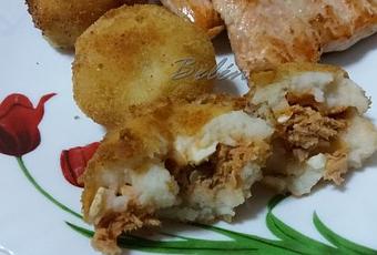 Ingredientes:1 bolsa de copos de puré de patata1 nuez de mantequilla50 gr de atún en escabeche3 huevospan ralladosalpimientaperejil