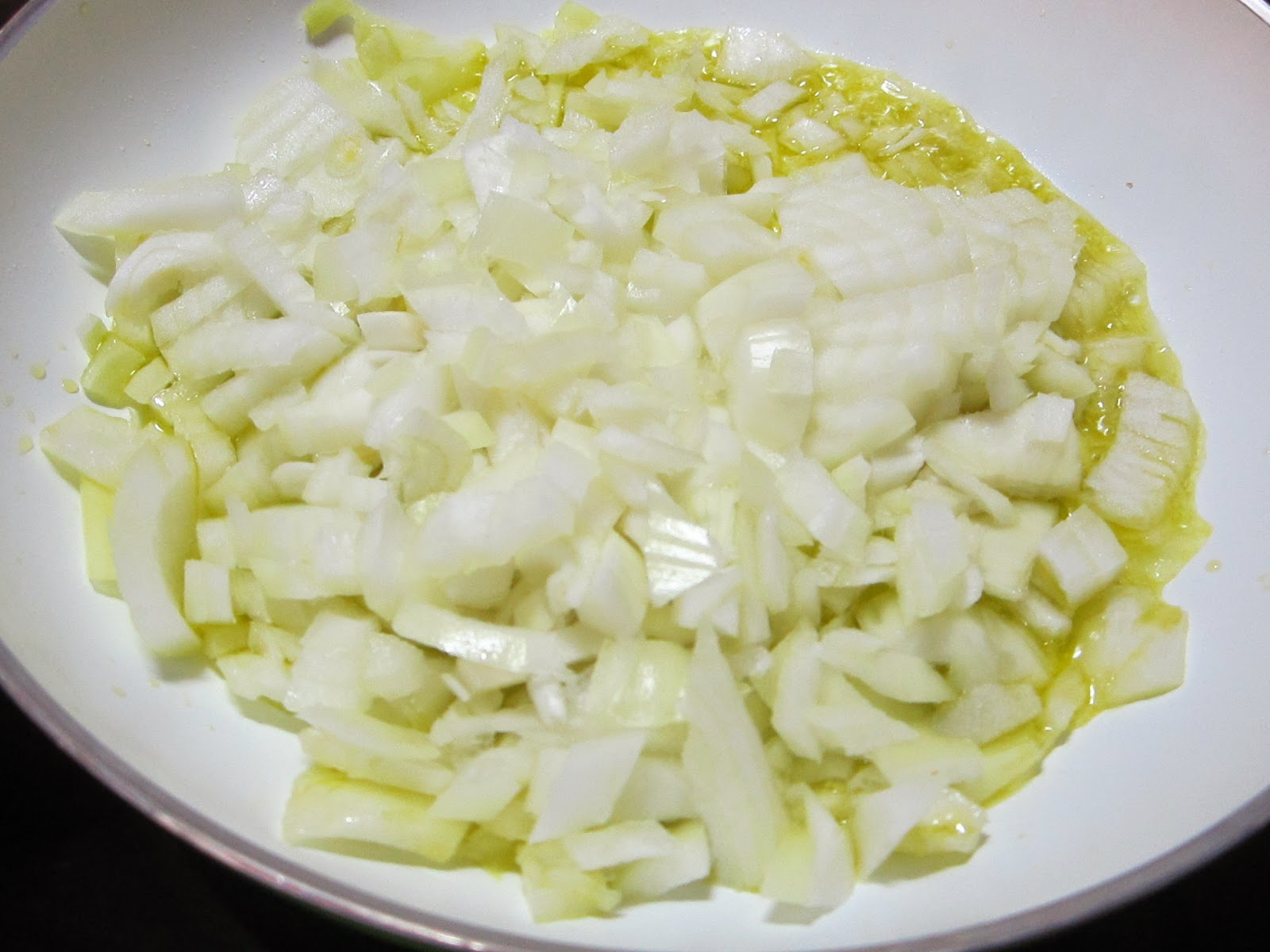 Vamos a picar la cebolla fina y la vamos a poner a pochar a fuego lento con aceite de oliva. Hasta que quede transparente pero no dorada.