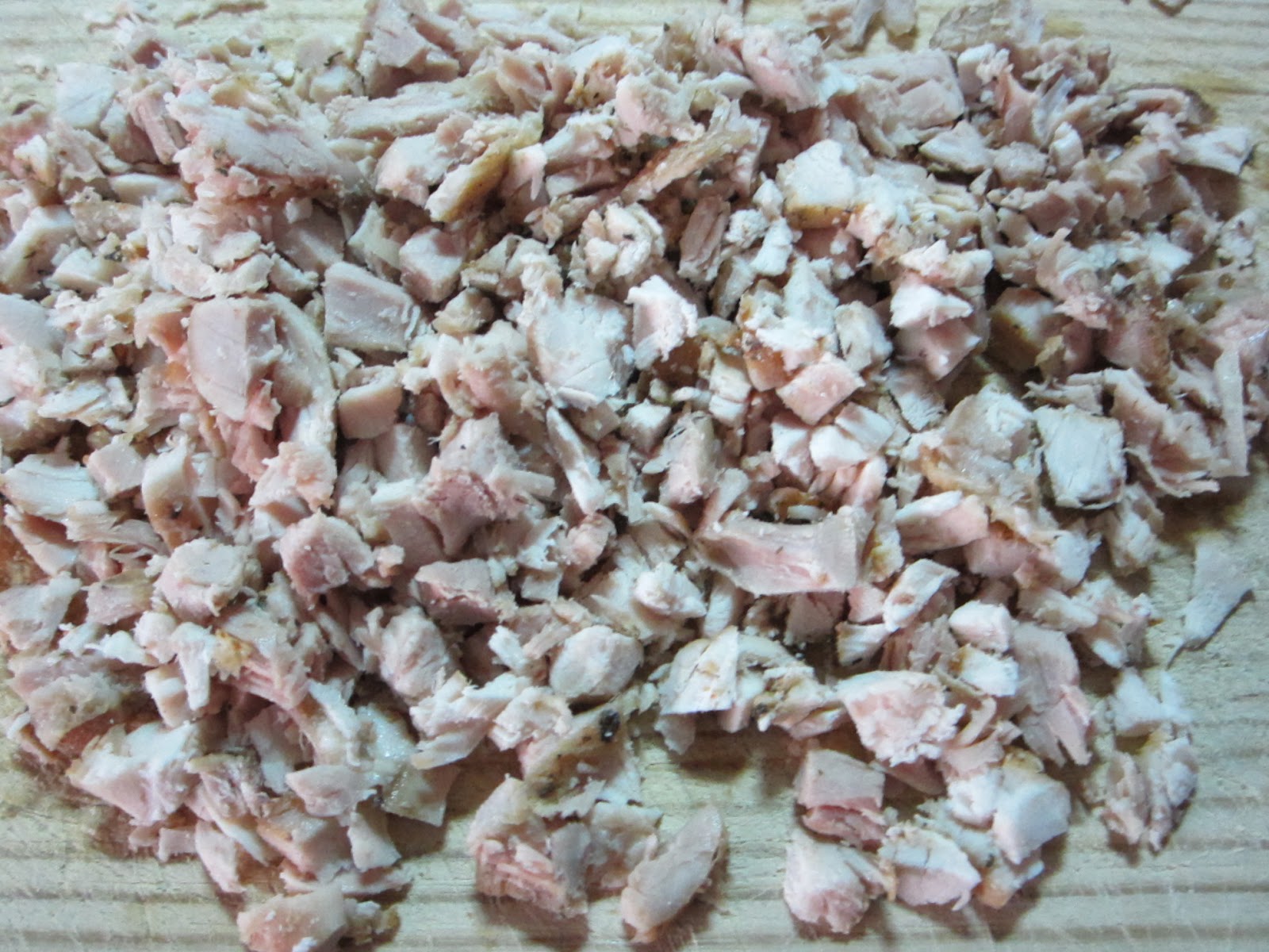 Los restos de pollo asado los limpiamos bien de huesos y pieles y picamos, depende si nos gustan encontrar bien los trozos los picaremos más o menos.