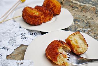 Hacer porciones y pasarlas por huevo batido y pan rallado, freír en abundante aceite caliente y dejar reposa encima de papel absorbente. Servir.