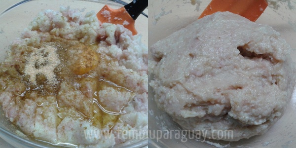 En un bol mezclamos el pollo picado (en este caso usé crudo, pero también podes usar restos de pollo cocinado) con el puré de coliflor, el ajo picado, el huevo, la sal y condimentos. Agregamos el pan rallado, yo utilicé 5 cdas, pero puede que necesites un poco más o un poco menos, dependiendo de la consistencia. No debe quedar ni muy blando ni muy dura.