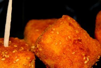 Esta vez he hecho las croquetas cuadradas, he cortado la masa en pequeños prismas cuadrados y los he pasado por harina, huevo y pan rallado mezclado con sésamo.