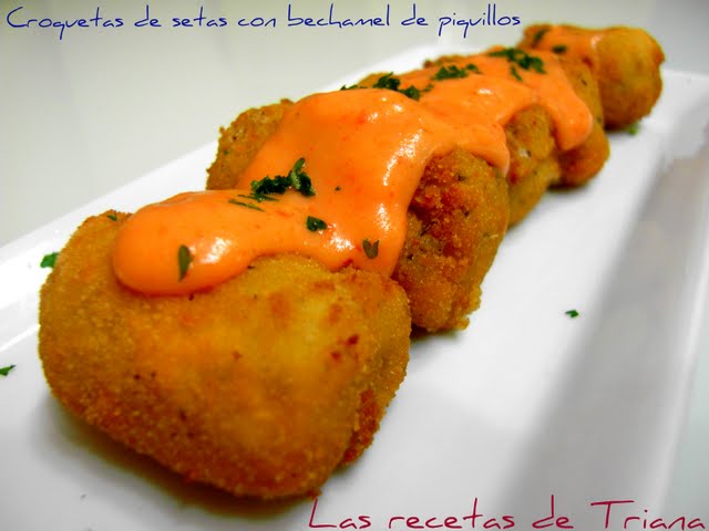1.- Unimos el aceite y la mantequilla y ponemos a calentar.2.- Cuando este caliente ponemos a fuego medio y añadimos la cebolleta y vamos pochando, cuando estén a punto añadimos las setas muy picadas y salteamos para que pierdan el exceso de agua que tienen.3.- Vamos añadiendo la harina poco y vamos tostando.4.- A continuación incorporamos la leche templada anteriormente y vamos removiendo con varillas para que no forme grumos con la harina.5.- Rectificamos de sal la masa e incorporamos la nuez moscada.6.- Movemos con cuidado y sabremos que la masa esta terminada cuando se despegue de las paredes.7.- Colocamos la masa en un recipiente y dejamos enfriar.8.- Una vez fria damos forma a nuestra croquetas.9.- Pasamos por el huevo batido, pan rallado y freír en aceite de oliva hasta que estén doradas.Salsa1.- Deshacemos una cucharada de mantequilla en un sarten.2.- Picamos los pimientos del piquillo y salteamos con la mantequilla.3.- Ponemos un poco de brandy a los pimientos y dejamos que evapore el alcohol.4.- Incorporamos la nata y dejamos que hierva.5.- Salpimentamos y trituramos.....