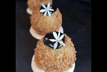 Las delicias de gambas con el toque exótico del alga wakame, la cremosidad de la leche de coco y el sabor intenso del parmesano, todo envuelto en una capa crocante de panco y acompañado de un alioli de ajo negro que le da un giro único.