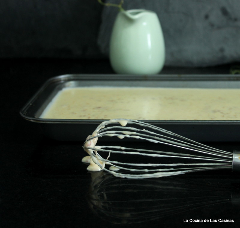 Bate energicamente con las varillas hasta que la gelatina se deshaga. Vierte la crema en un molde, cubre con papel film a piel para que no se forme costra e introduces en el frigorífico 24 horas o hasta que la bechamel haya cuajado.