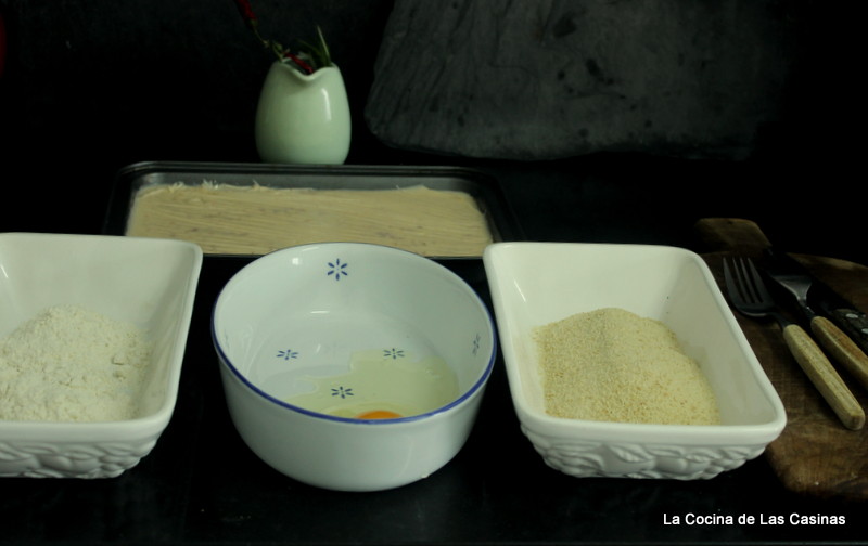 Corta en cuadraditos y reboza en harina, huevo y el rebozado que hayas elegido, procura que no te quede ninguna parte sin rebozar, este es un paso importante, piensa que las vas a freír y la gelatina con el calor se deshace. Introduce en la nevera al menos una hora. Pasado el tiempo vuelve a rebozar con el pan rallado en el caso que sea el que has elegido.