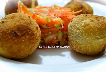 Hacemos bolas con la batata y pasamos por huevo y pan rallado