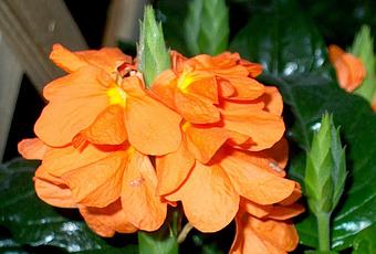 El Crossandra es una planta de la familia Acanthaceae y proviene de la India. Su altura oscila entre 30 y 50 cm de altura, con hojas grandes y bordes ligeramente onduladas, de color verde oscuro.
