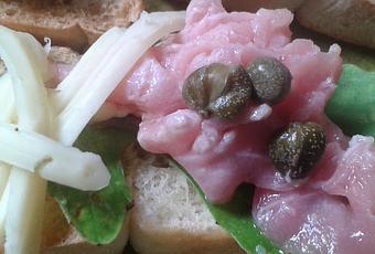 Poner el atún en el congelador, cuando esté duro, pero no extremadamente congelado cortar en láminas muy finas.Macerar el atún en una mezcla de vinagre, limón, sal y aceite de oliva.Tostar las rodajas de pan con aceite de oliva y agregar una hoja de rúcula, el atún marinado, parmesano rallado y alcaparras. Rociar con aceite de oliva.
