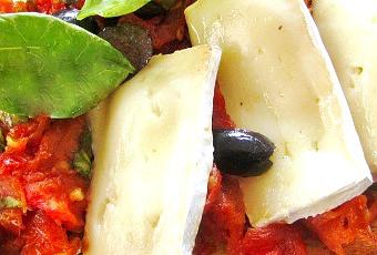 Solo nos falta armar el crostini. Para eso sobre la tostada acomodamos primero una buena porción de tomates, tres lonchitas de queso y algunas láminas de aceitunas. Llevamos unos minutitos al horno que todavía estará caliente hasta que se ablande el queso, pero que no se derrita.