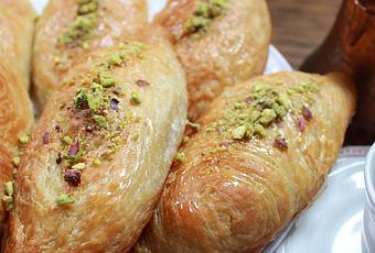 Es una especie de cruasán de lo más hojaldrado con ese sabor y olor a mantequilla rica....el relleno es una crema muy suave a base de sémola, leche y nata y todo bañado con un almíbar aromatizado con limón y agua de azahar y que le otorga a estos cruasanes un toque ligeramente dulce y realmente irresistible...