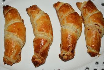 Repartimos el queso sobre los triángulos de hojaldre y los enrollamos empezando por la parte mas ancha.