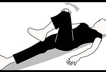 Cruzamos la pierna por encima del cuerpo, intentando llevar el pie al suelo lo más cerca posible de la mano derecha. Ambas rodillas están dobladas.