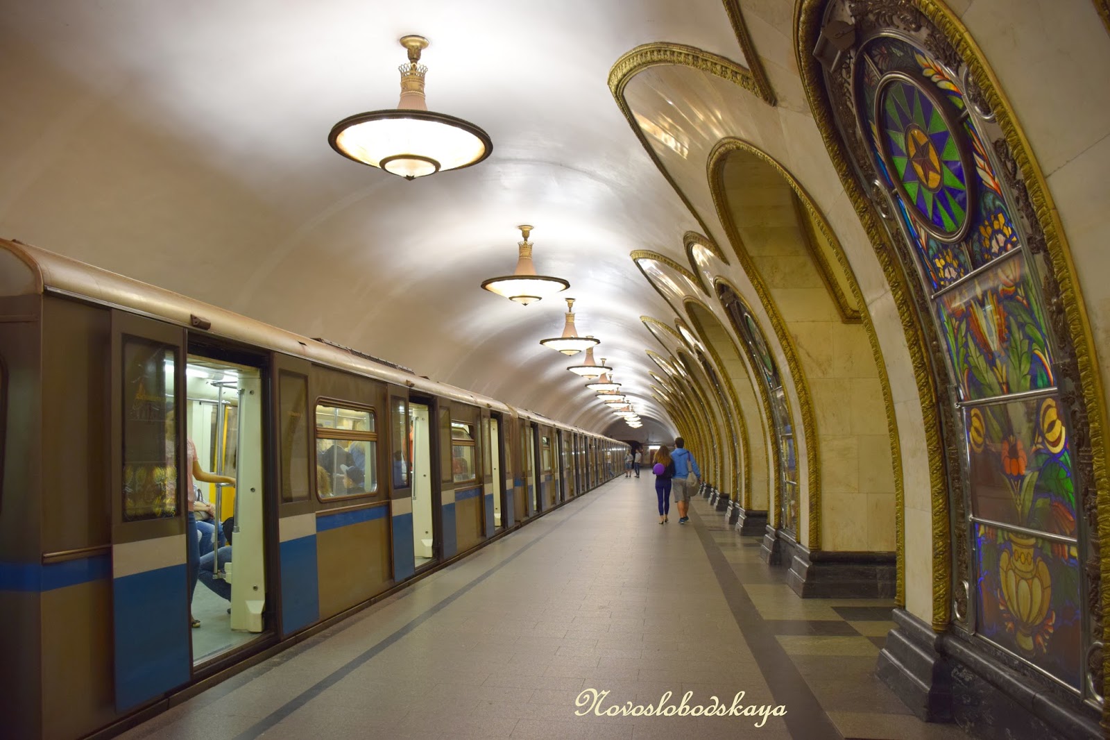 Novoslobodskaya... bellísima decoración! 32 vidrieras con motivos florales y geométricos, enmarcadas en elaborados marcos de latón e iluminados desde dentro, impactan por su belleza. Pilares y arcos decorados por mármol de los Urales y rematados con molduras de latón. Y en el extremo de un andén, un impresionante mosaico (que elegí como foto de portada) con una