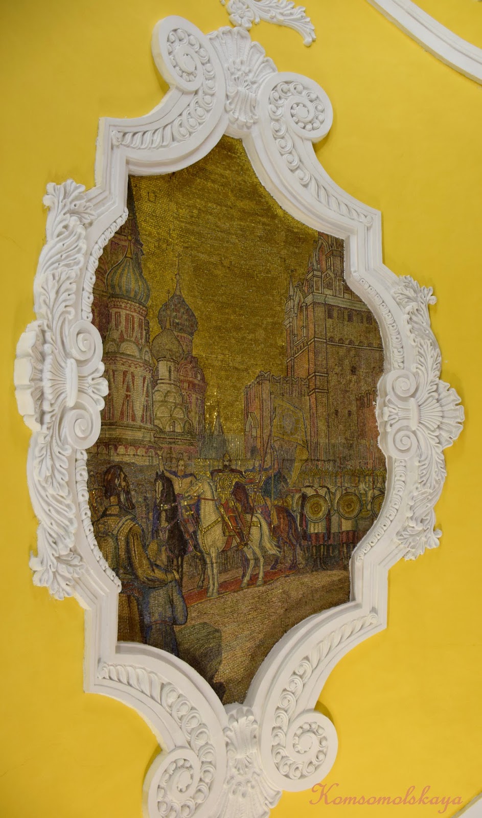 Komsomolskaya... palaciega total! Derrocha opulencia, con su grandioso techo estilo barroco, pintado de amarillo, con incrustaciones de mosaicos representando la lucha del pueblo ruso por su independencia, enmarcados por moldes florales blancos, sustentado sobre elegantes columnas de mármol con capiteles jónicos; las lamparas son espectaculares, los suelos perfectos , las forjas maravillosas... todo, absolutamente todo está