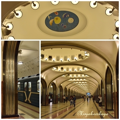 Mayakoskaya, hermosa estación que data de 1938 y debe su nombre al poeta ruso Vladimir Mayakosvky. Está a 33 metros bajo tierra y sirvió de refugio durante la Segunda Guerra Mundial. Es obra de Alexey Dushkin en estilo Art Deco con agraciados pilares enfrentados con acero inoxidable y rosa rhodonite, las paredes y suelos están acabados con granito y mármol en cuatro tonos diferentes, el techo está coronado por mosaicos de Alexander Deineka y representan "un día en el cielo soviético"
