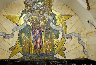 Prospekt Mira, otra joya del subsuelo moscovita! Mármol por doquier, arañas impresionantes, relieves cerámicos en elegante color marfil, sobre fondo dorado, que rinden tributo a la agricultura soviética, todo sobre un pulido suelo ajedrezado de granito gris y negro.