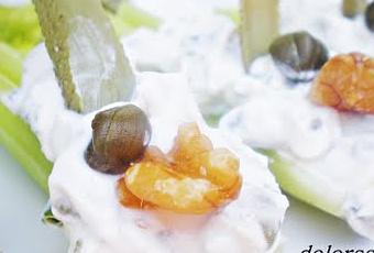 Rellenar con esta mezcla los trozos de apio (menos un extremo) y decorarlos con las alcaparras, el pepinillo y nueces reservadas.