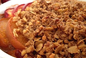 De pequeña no me gustaban nada los postres con frutas. El sabor de la fruta caliente o cocinada no era para mí nada especial, todo lo contrario. Cuando comía una tarta de manzana le quitaba las rodajas de fruta y me comía el resto, que suerte que el paladar vaya cambiando cuando vas creciendo, porque ahora resulta que algunos postres con frutas son de mis favoritos. El crumble por ejemplo, da igual de qué esté hecho, que para mí es exquisito. Muy muy fácil de preparar, es una de esas recetas rápidas y deliciosas que hacen un magnífico postre. El crumble de este viernes está hecho con albaricoques y ciruelas, que ya están de temporada, pero podríais utilizar cualquier fruta a la que le vaya bien el calor del horno (manzanas, melocotones, arándanos, etc.). Para la cobertura crujiente he sustituido la harina que suele llevar este plato, por copos y salvado de avena y almendras picadas. El contraste de texturas es fantástico. Lo mejor es servirlo templado o a temperatura ambiente con una cucharada de nata montada, crème fraîche o helado de vainilla. Espero que os guste.