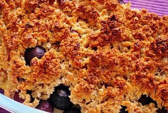 Se corta la manzana en láminas. Se colocan las láminas de manzana en un recipiente para horno. Se añaden los arándanos. Se coloca el crumble encima de la fruta y se mete al horno hasta que esté tostado.