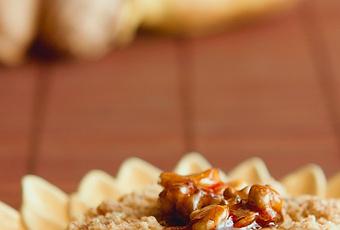 Ingredientes150 gr. de harina75 gr. de mantequilla a temperatura ambiente50 gr. de azúcar moreno75 gr. de Nueces de California molidasCanela en polvoUn pelín de salPara decorar: