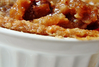 Para preparar el crumble, mezclamos la harina con el azúcar, cardamomo, almendra, sal y los copos de avena. Después incorporamos la mantequilla en dados, y trabajamos para tener una masa homogénea.
