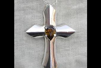 En el centro de la cruz, y elevado sobre la misma, se encuentra una Turmalina talla pera engastada por patillas.