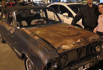 “Este Falcon Futura es modelo 71. Acá en el techo había un agujero, lo cerramos con chapa, remaches y brea, ni una gota de agua cuando llueve. El tapizado del techo es arpillera”, me decía orgullosa Gaby. “Estuvo 6 años parado debajo de un árbol, algún día vamos a laquearlo para que el óxido quede así, intacto”.