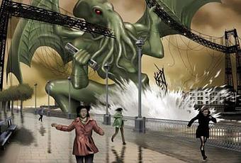 Cthulhu saliendo en el Abra de Getxo y destrozando el Puente Colgante de Portugalete (Uno de los 9 puentes mas espectaculares del mundo, y no lo digo yo), aunque su nombre oficial es Puente de Bizkaia (O Vizcaya, como se prefiera, ambas grafias están aceptadas). Curiosamente, la ilustración esta "tomada" desde el lado de Portugalete.