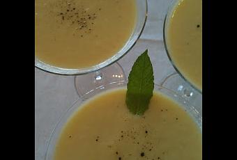 Ingredientes ( Para 8 raciones ). - 9 Puerros ( la parte blanca) - 1 Patata. - Una Cucharada de Mantequilla. - 4 Cucharadas de Aceite de oliva. - 1 1/2 l. de caldo de ave. - Media cucharadita de sal. - Medio vaso de Nata. - Pimienta negra recién molida. - 4 Hojitas de hierbabuena.